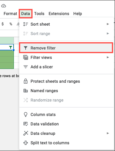 6. When you finish, remove the filter by selecting Data then Remove Filter in the menu.