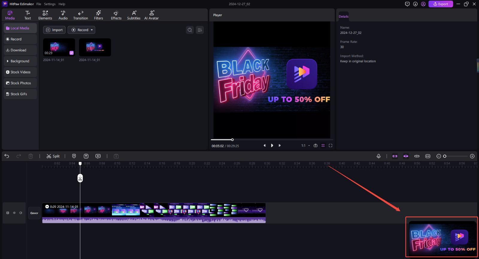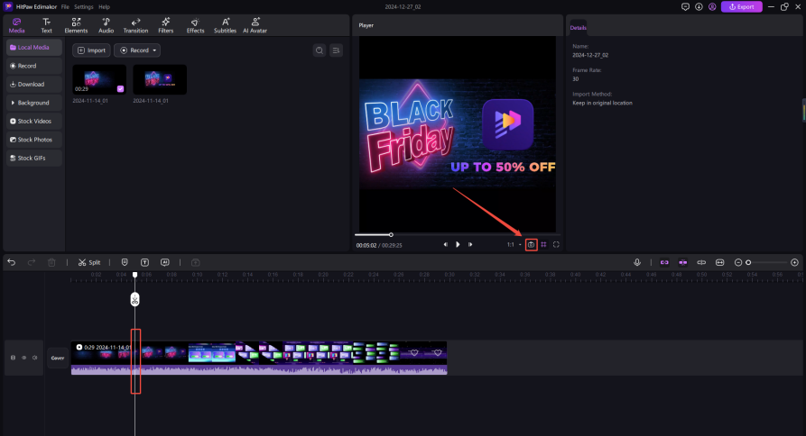 Tips: Click the icon immediately after taking a snapshot, as the thumbnail appears for only a few seconds. If you miss it, you can find the snapshots in the default save location: C:\Users\Documents\HitPawEdimakor\Snapshots.