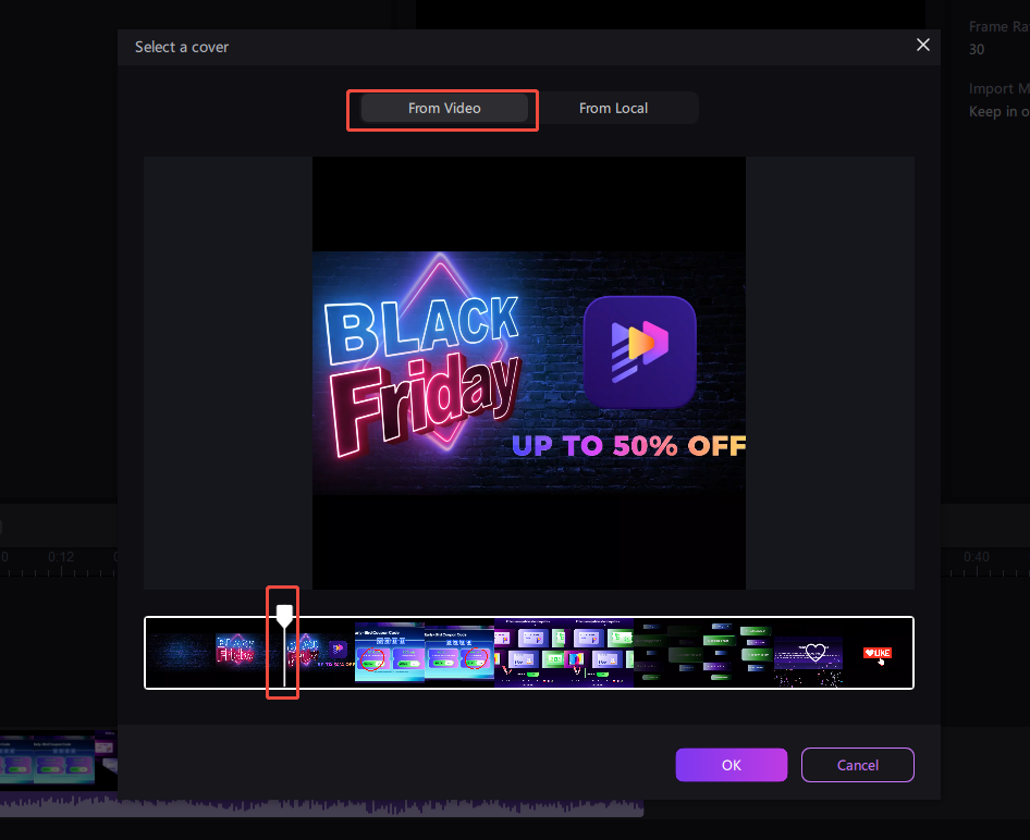 To add a cover photo to your video, select the “Cover” button in the Timeline's left-most corner. In the Select a Cover box, ensure the "From Video" tab is selected. Position the Skimmer on the desired frame and click OK in the bottom-right corner.