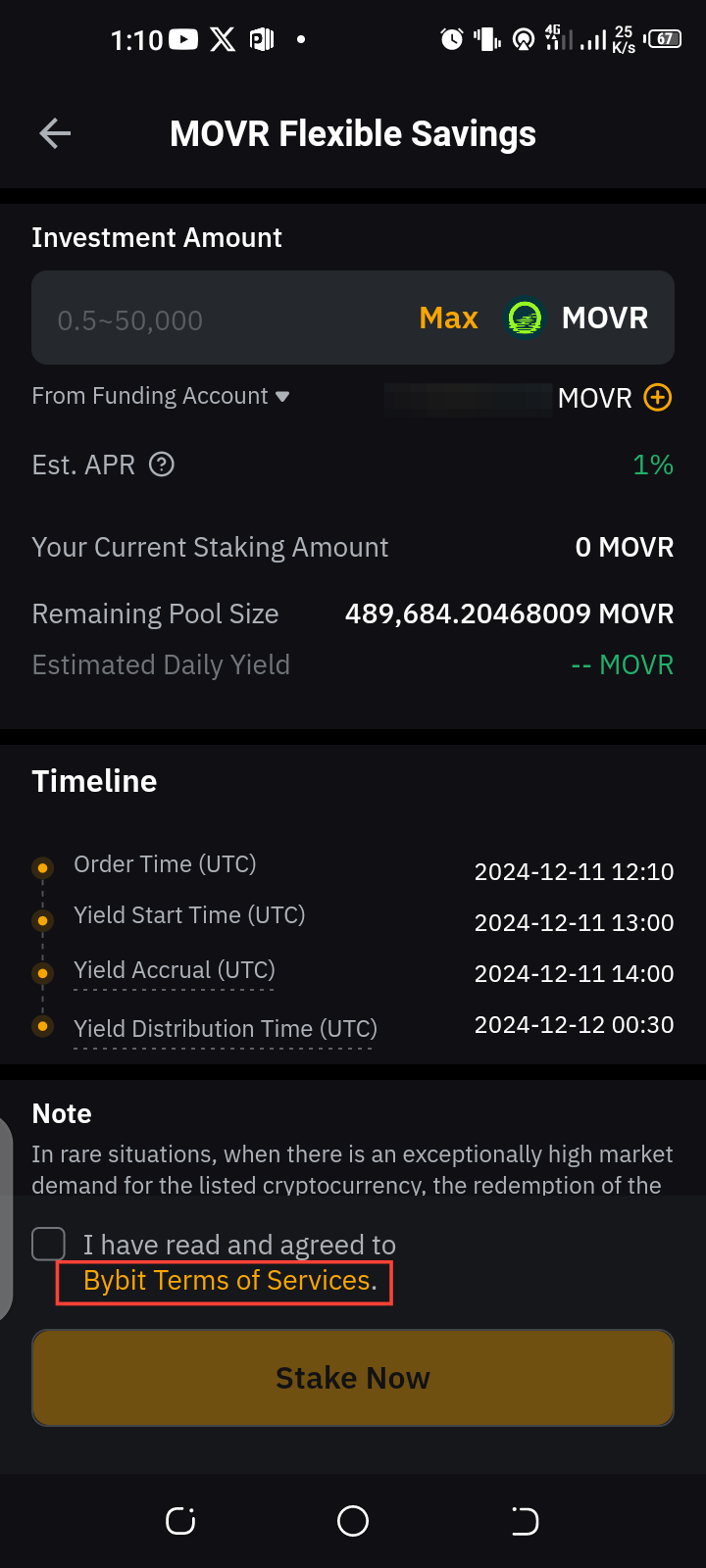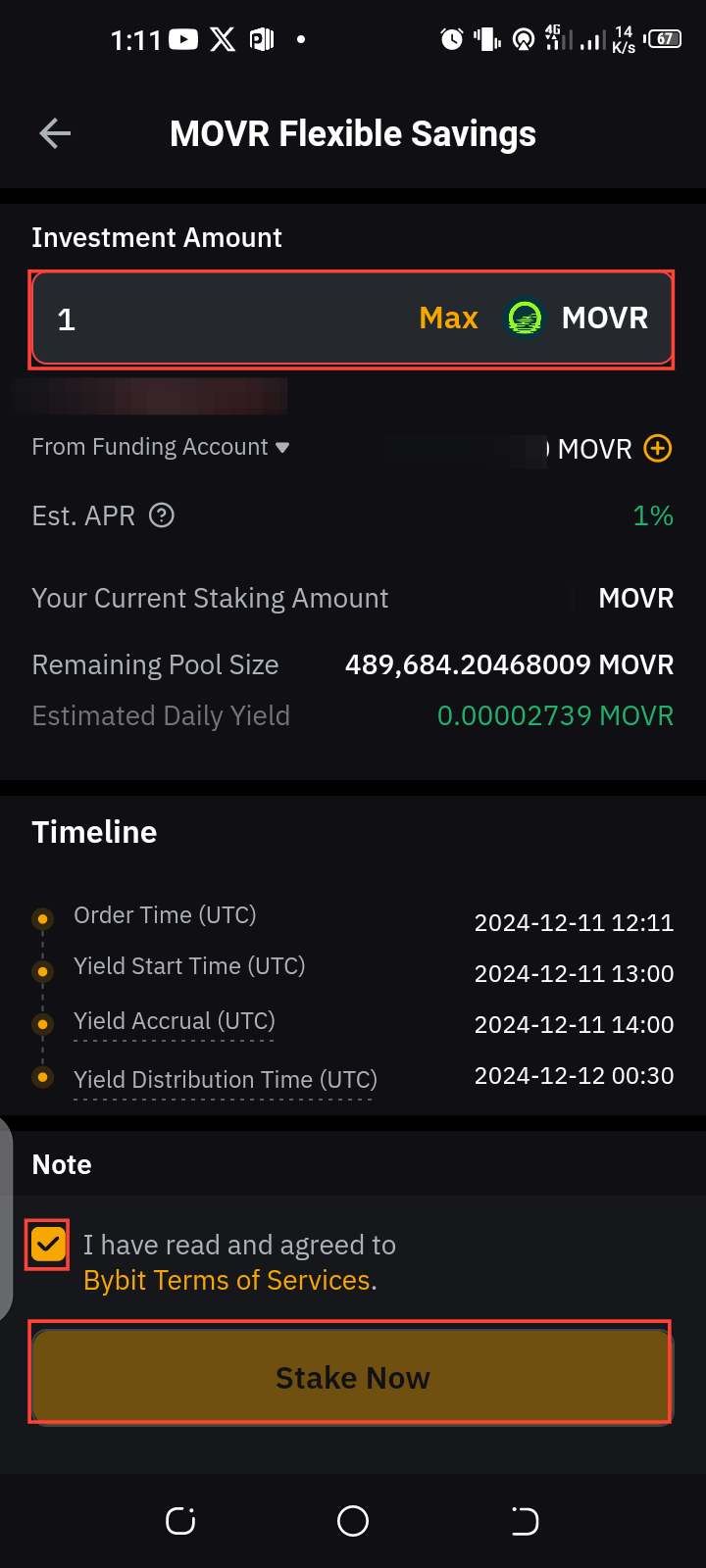 After selecting the staking plan, review the terms and conditions. Once you understand and agree to the terms, enter the amount of crypto you want to stake. Tick the box to confirm you’ve read and agreed to the terms.
