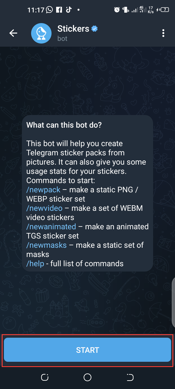 A chat window will open where you can tap on “Start.”