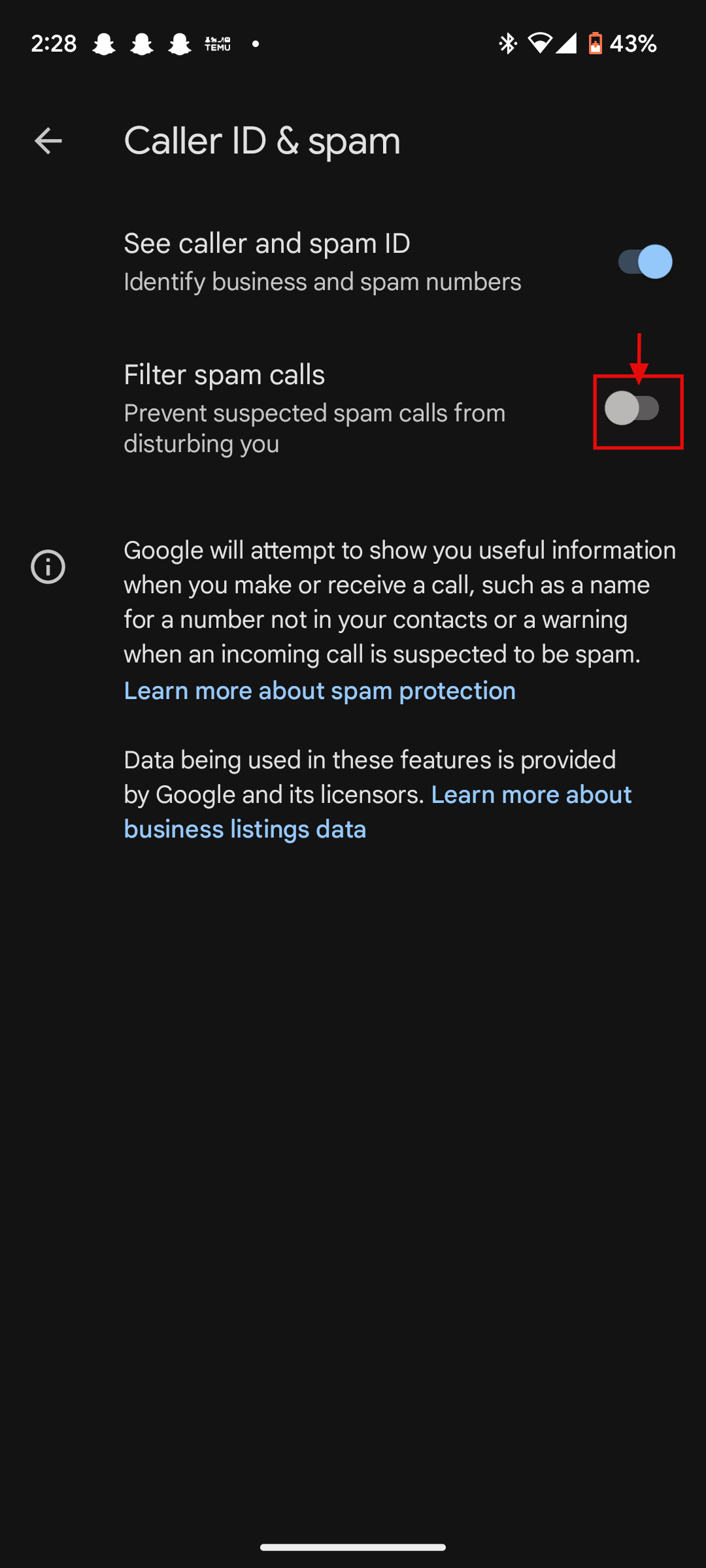 Step 3: Toggle on Filter spam calls