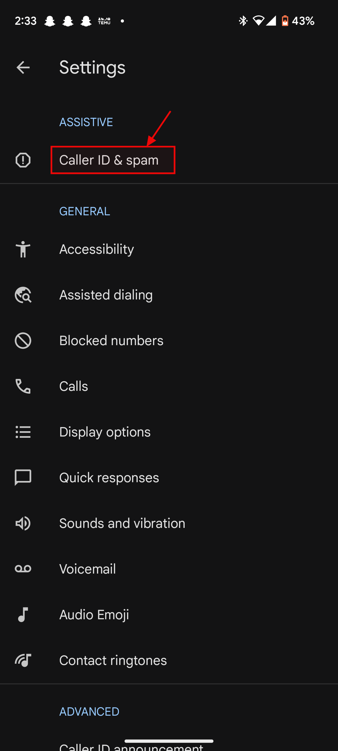 Step 2: Click on Settings and then click on Caller ID and spam