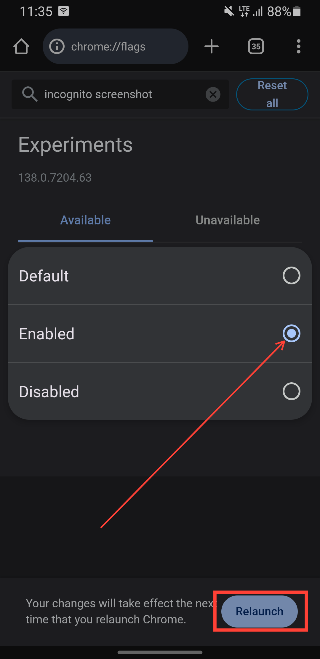 Step 4: Change the setting from "Default" to "Enabled" and tap the relaunch button at the bottom of the screen to relaunch your Chrome browser.