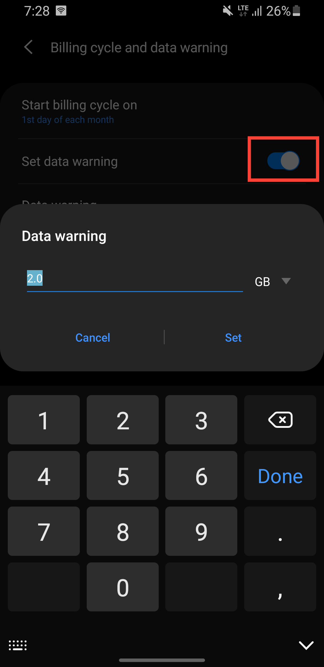 Step 4: Toggle on Set Data Warning and specify the data rate you want to receive the warning. I'm setting mine to 2GB, so once I've used up to 2GB of data on my phone, I get a warning notification.