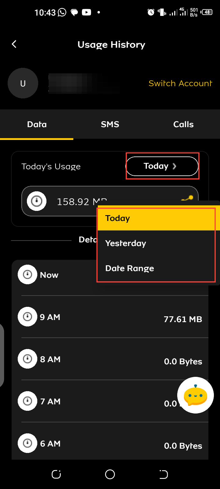 Step 4: Now you can select whether to check the data usage for "Today", or "Yesterday" or set a "Data Range" by tapping on the box beside "Today's usage".