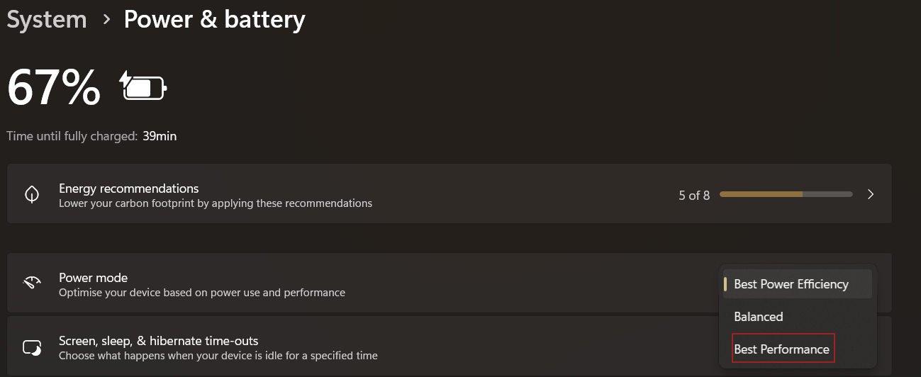 If your WiFi is fine but you notice that your PC keeps disconnecting from it, the problem might be that your PC's network card isn't receiving full power. To troubleshoot this, go to Settings > Systems > Power mode and toggle the option to best performance.