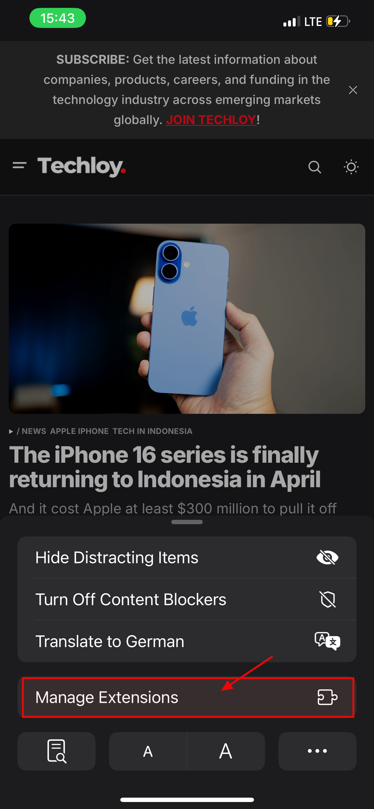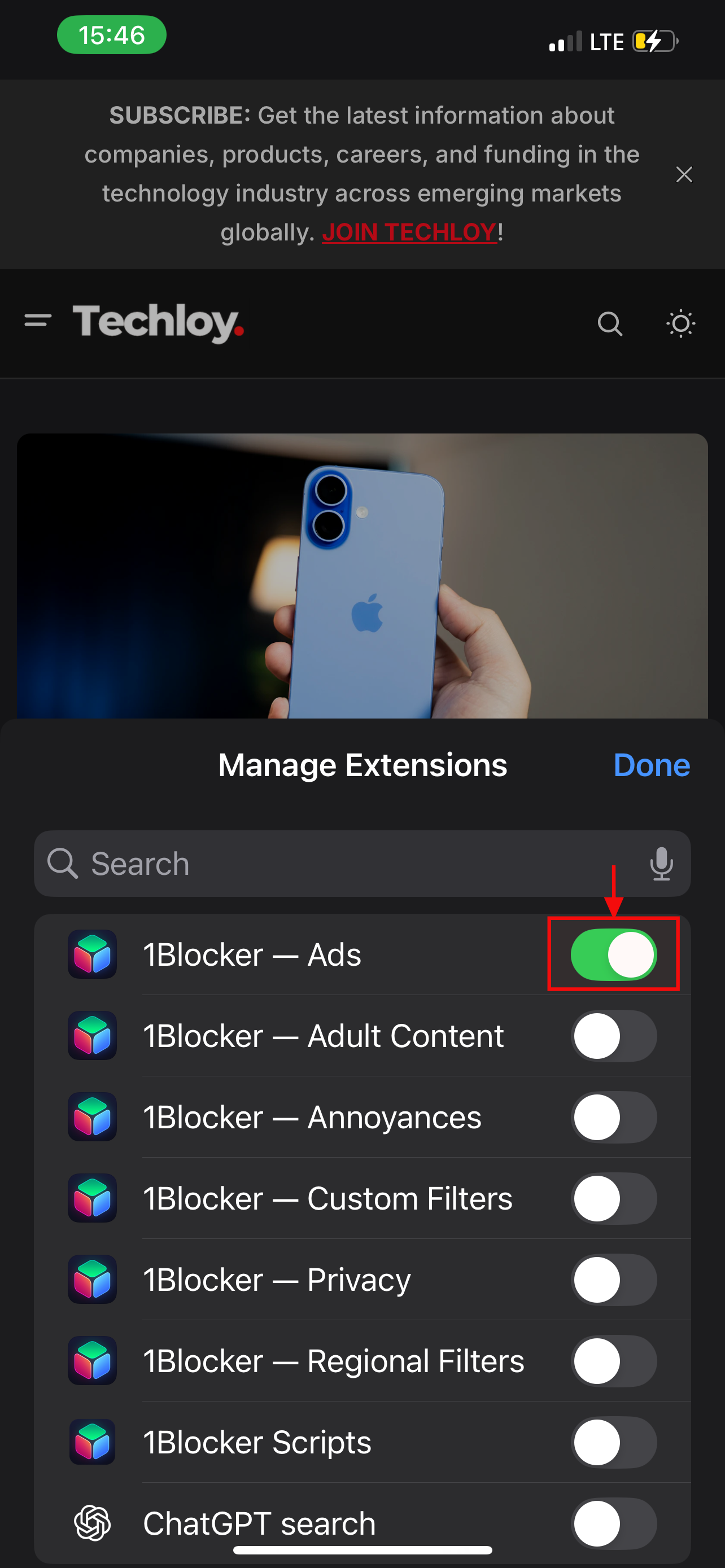 Step 4: Turn off the toggle for the relevant ad blocker extension (1Blocker — Ads)