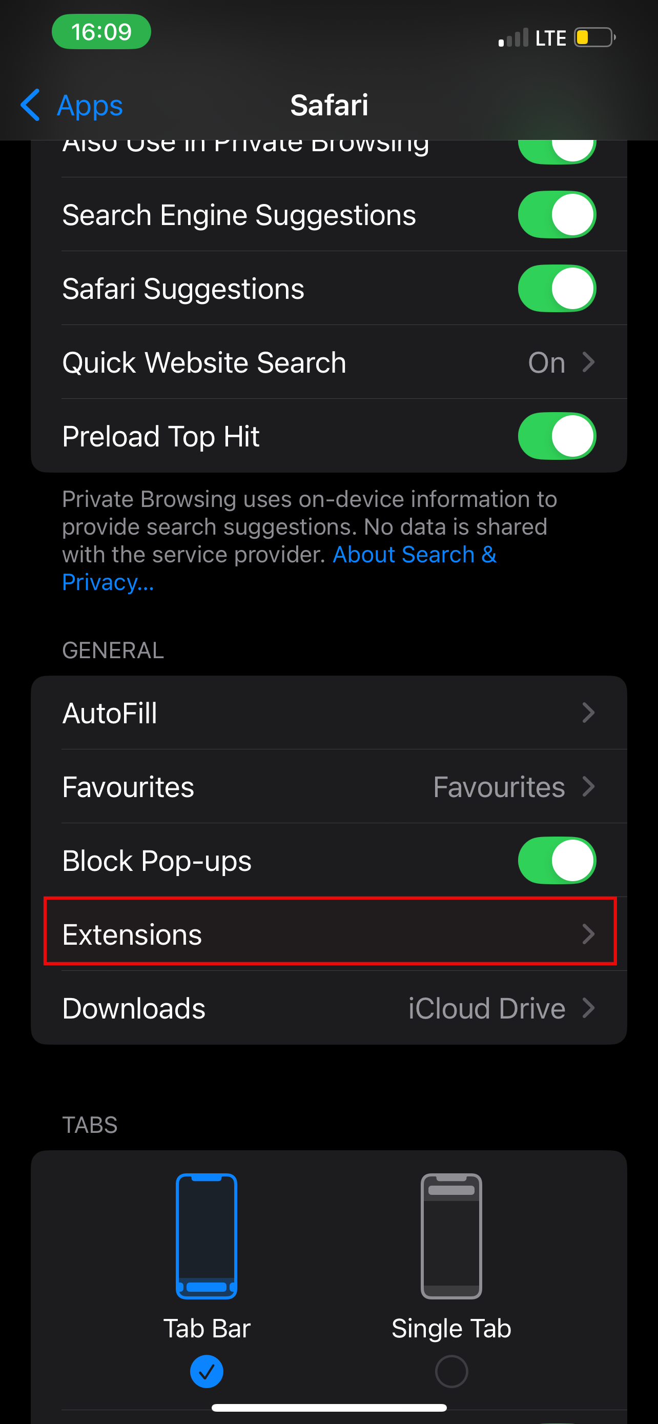 Step 4: Within the Safari settings, look for Extensions and click on it