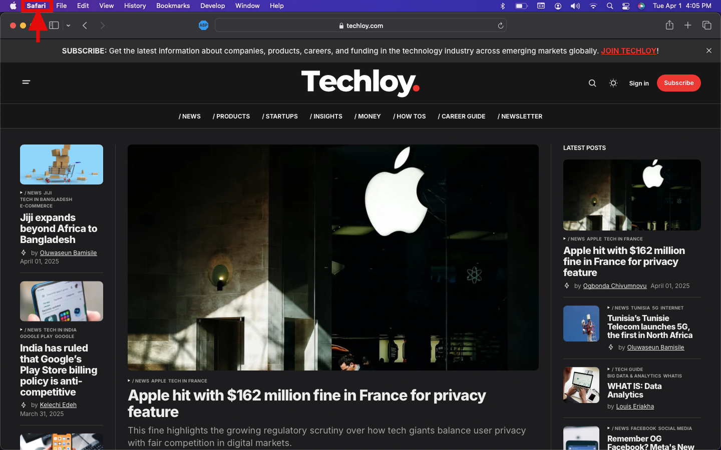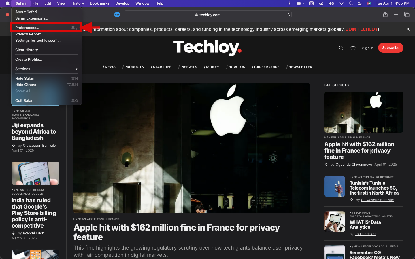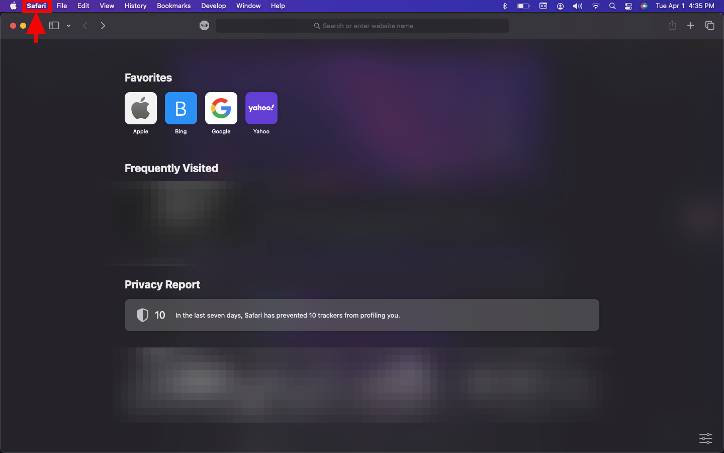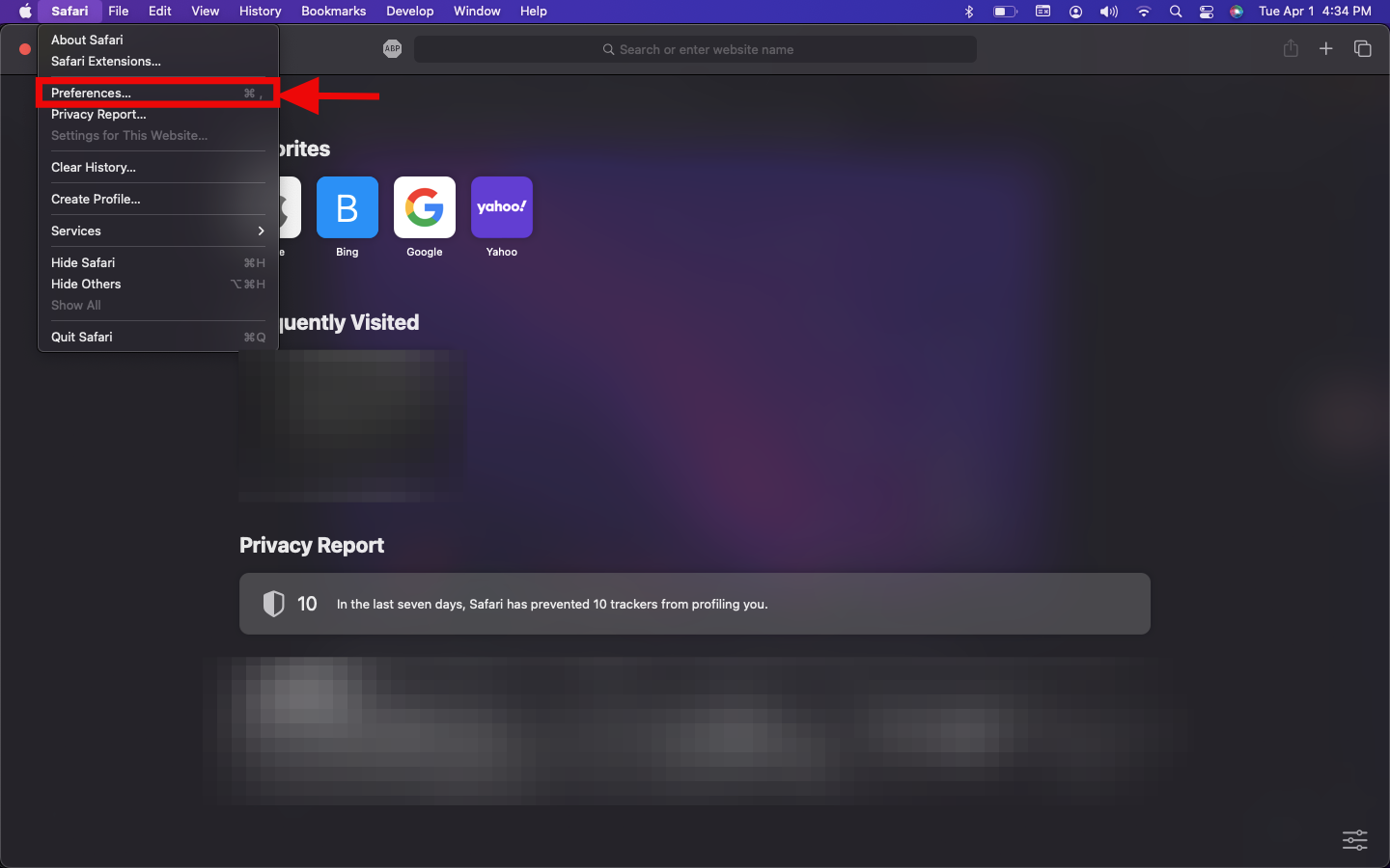 Step 2: From the menu bar, click on Safari, then click on Preferences