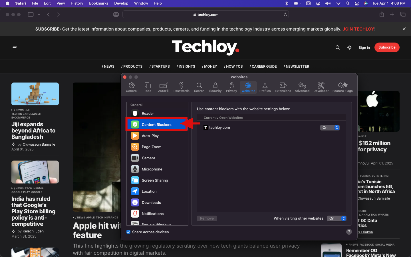 Step 3: From the options select Websites, and then click on Content Blockers from the left-side menu