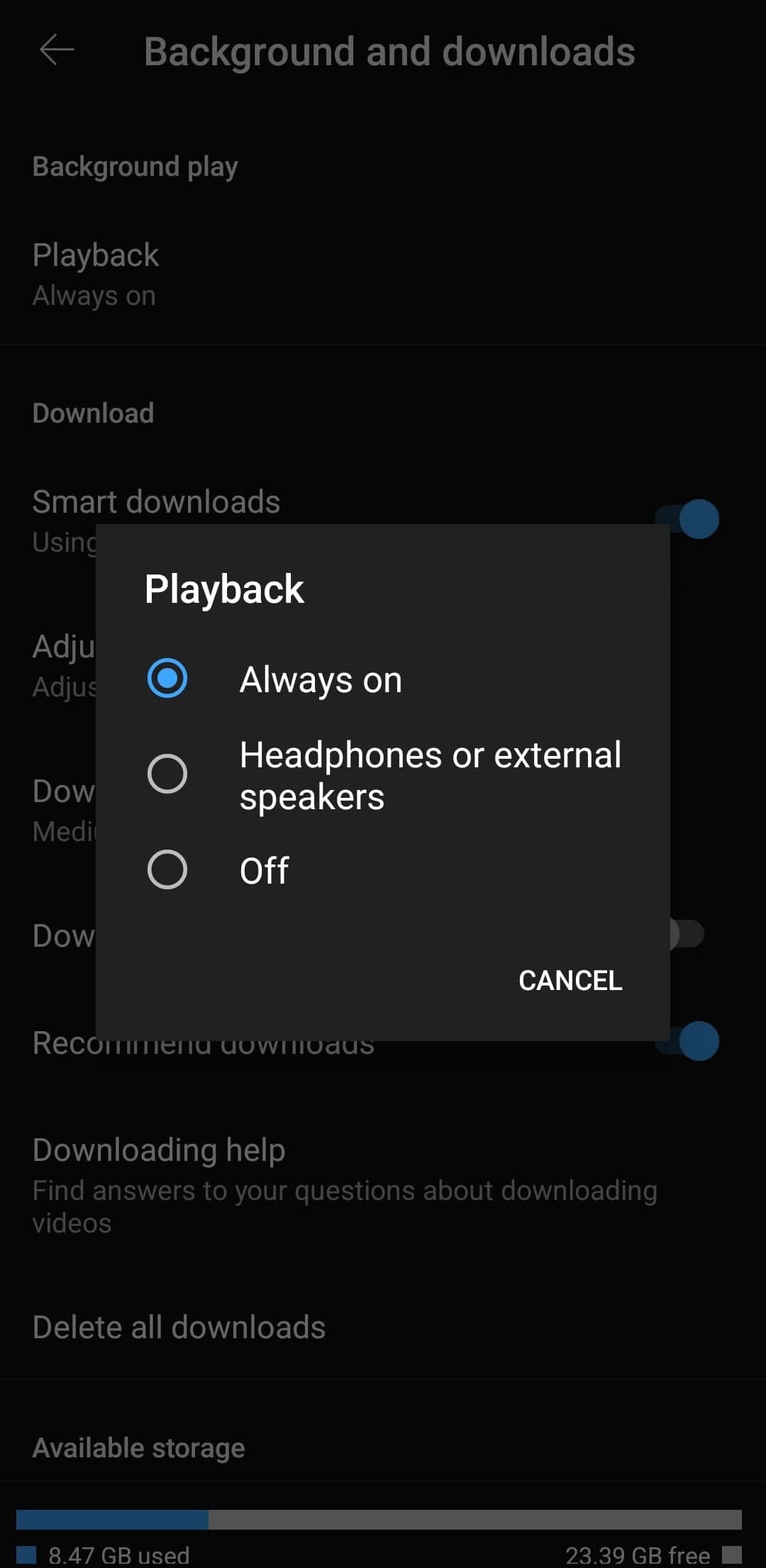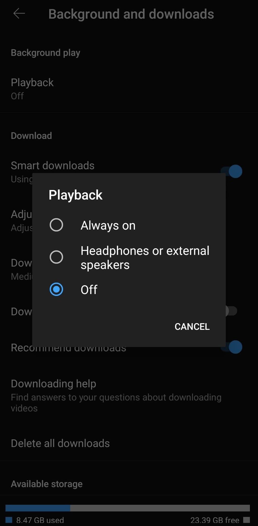 Step 6: To turn off background play, select the 'off' option. Alternatively, you could set it to only turn on background play whenever you have headphones or speakers plugged in by selecting 'Headphones or external speakers'