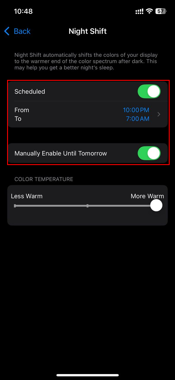 Step 3: Toggle on the "Manually Enable Until Tomorrow" option to enable Night Shift until the next day. Or select "Scheduled" to turn on automatically from sunset to sunrise, or set custom times