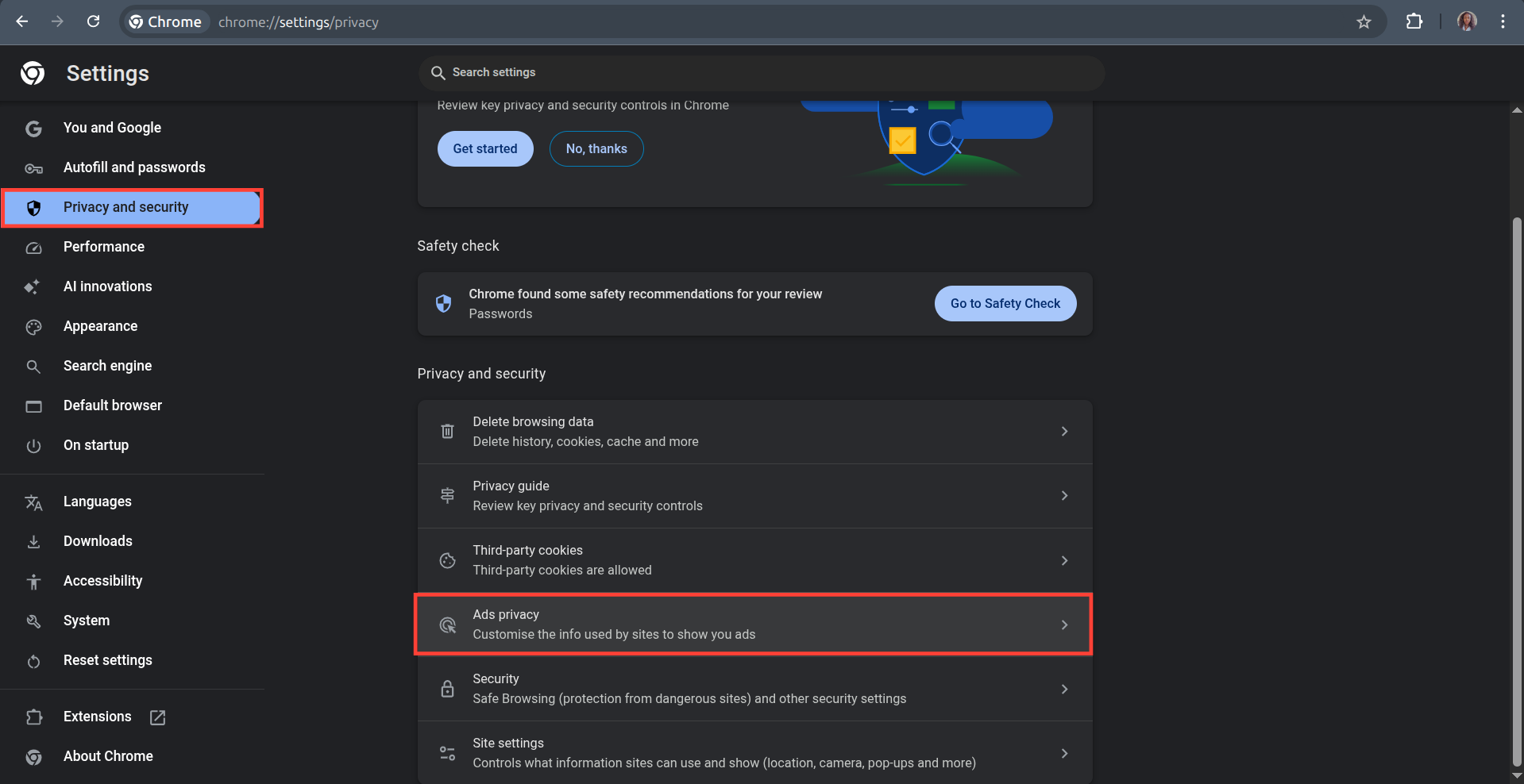 Step 3: Select Privacy and Security on the left panel and click on Ads Privacy.