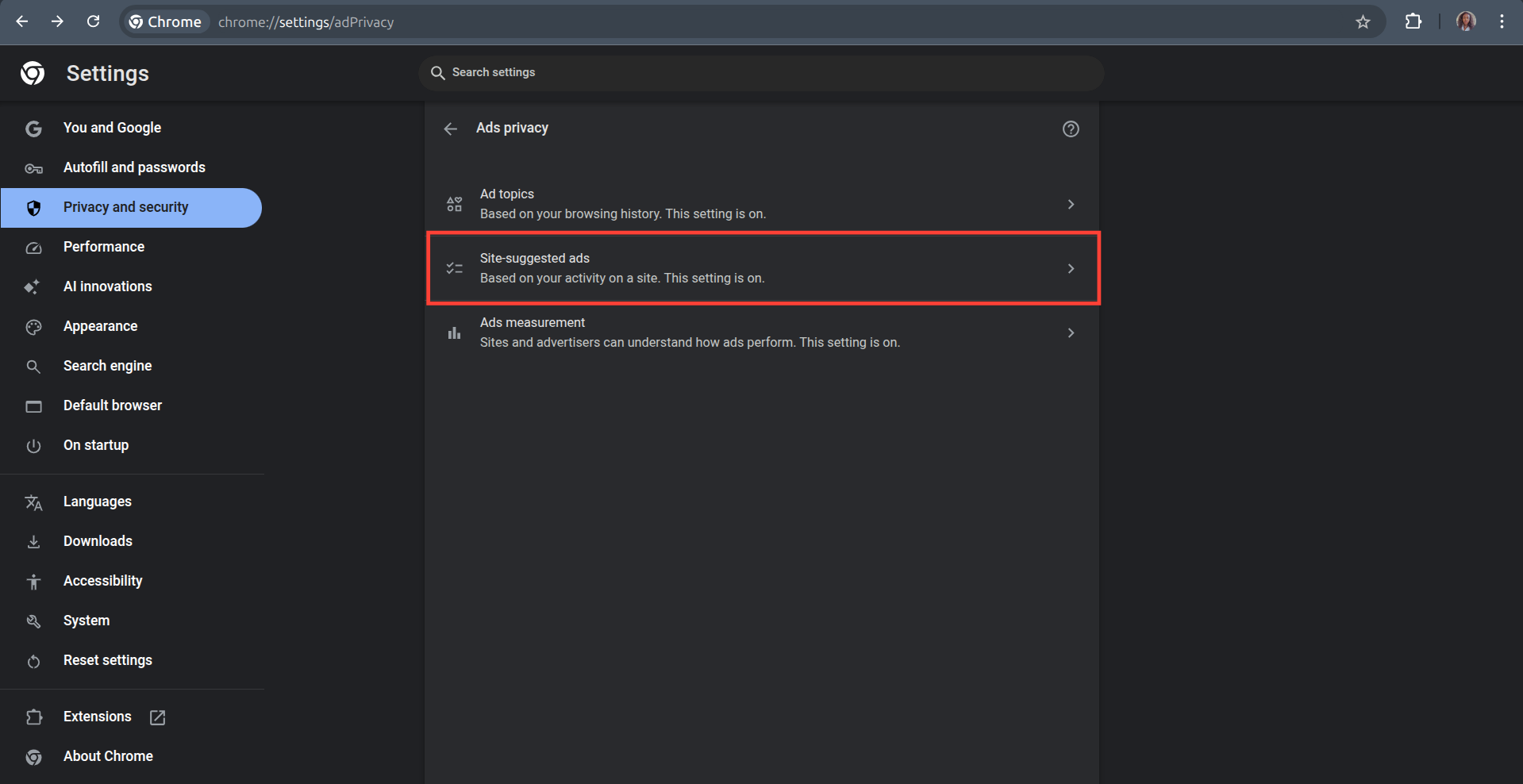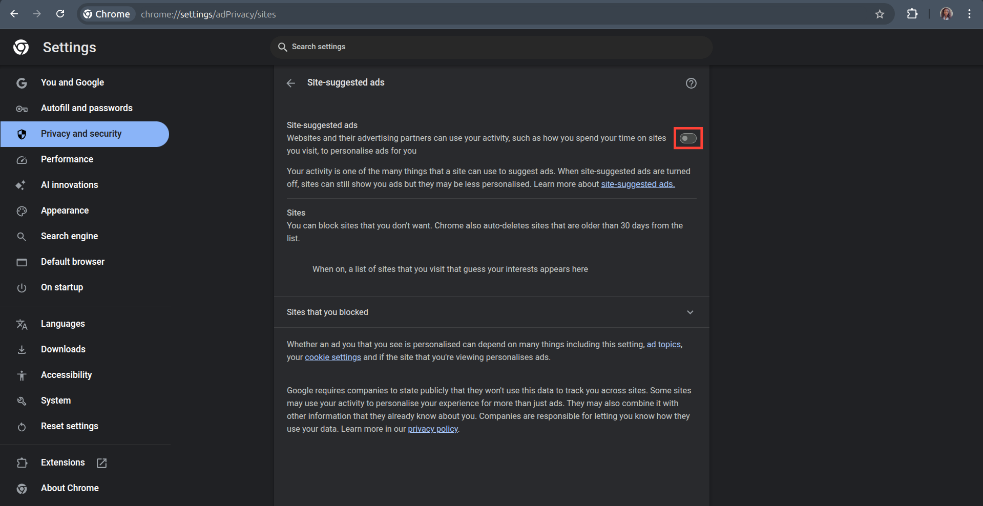Step 5: Toggle off the button next to Site Suggested Ads.