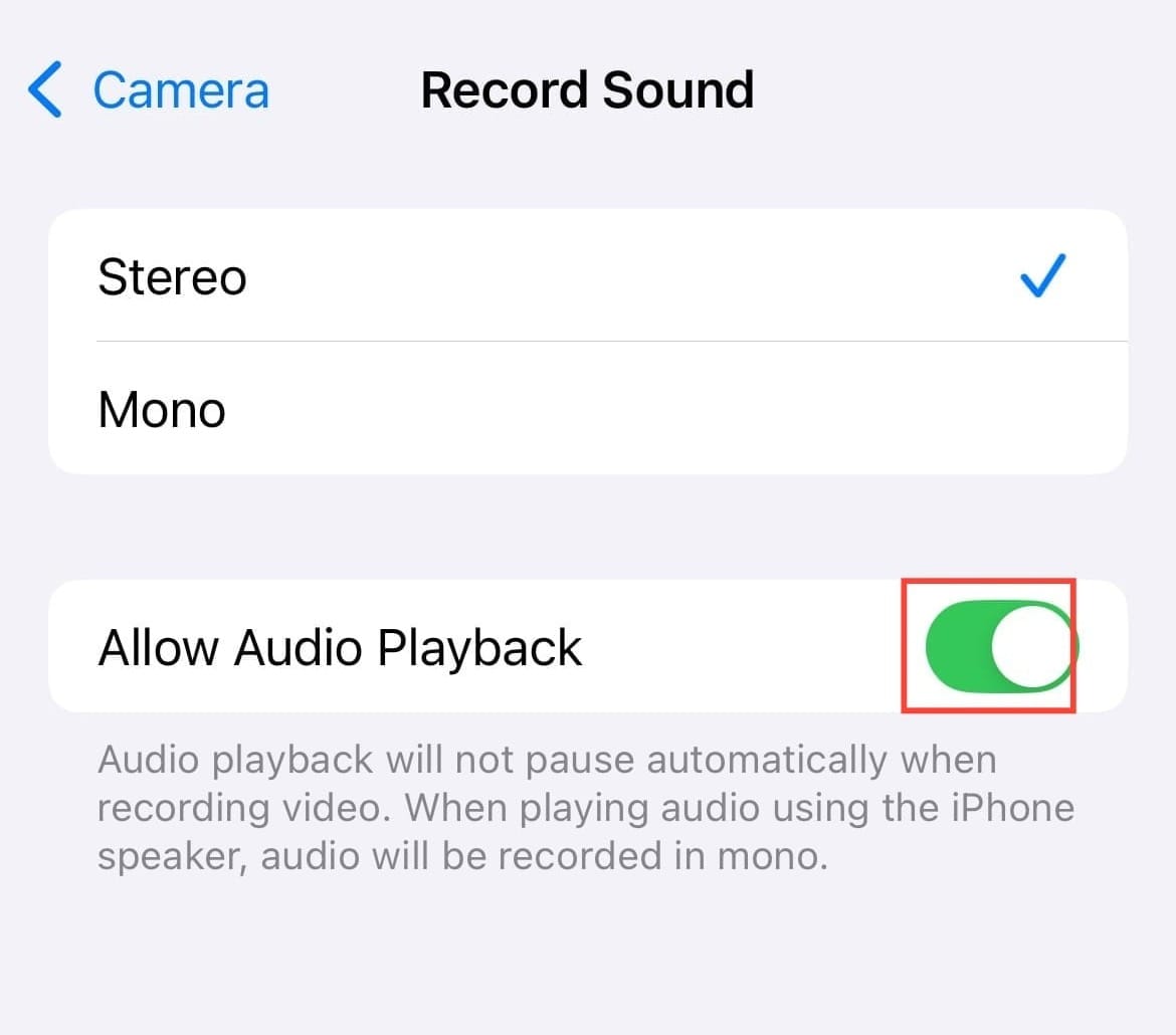 Step 4. Within the Record Sound section, you will see the "Allow Audio Playback" toggle. Turn this option on to enable audio playback while recording videos.