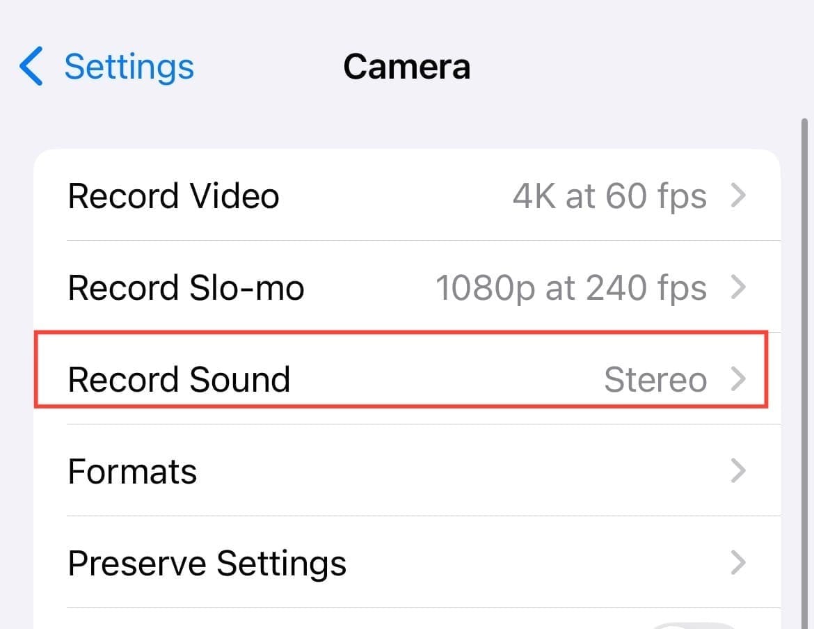 Step 3. Under the Camera settings, select the option labeled "Record Sound".