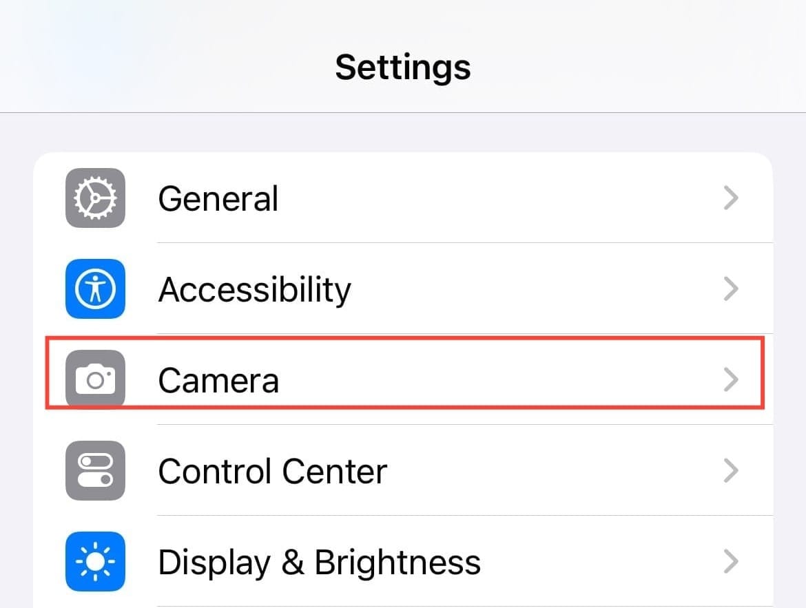 Step 2. Scroll down the Settings menu and tap "Camera" to open its settings.