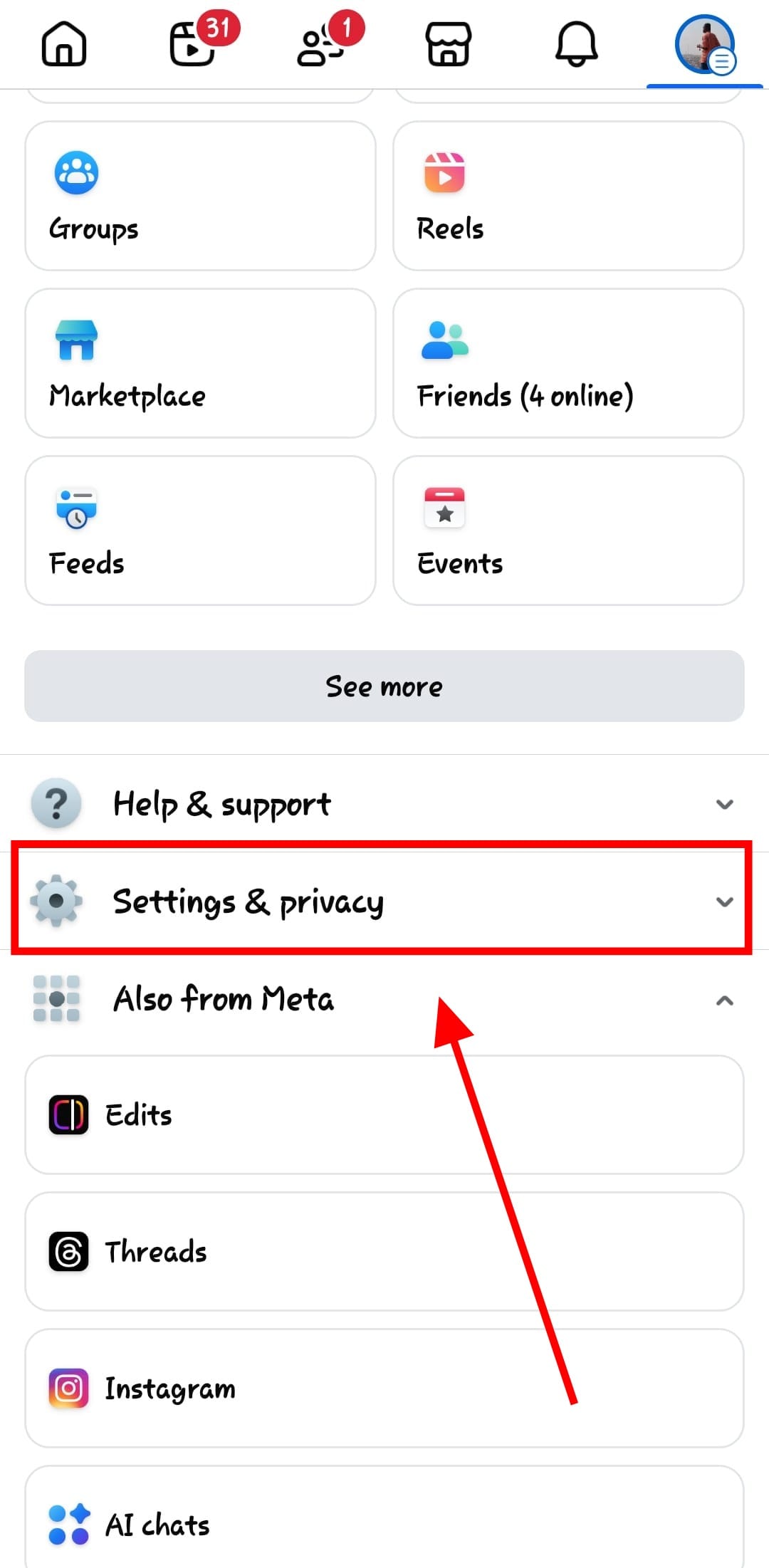 Step 2: Scroll down and tap on 'Settings & privacy'