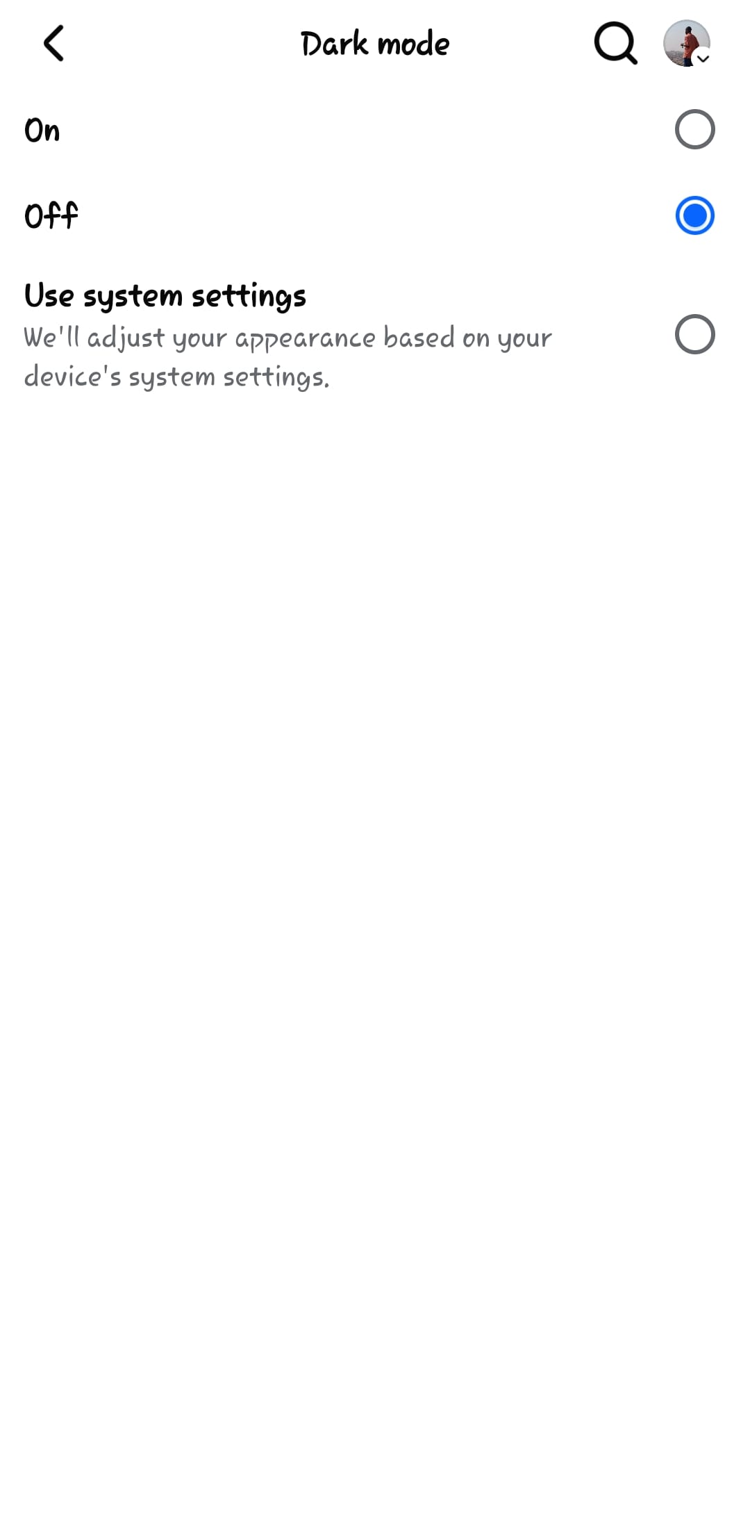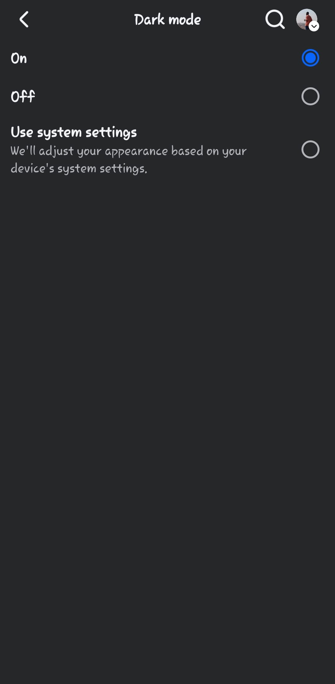 Step 4: Tap 'On' to enable dark mode immediately. You can also choose System if you want Facebook to match your device's appearance settings.