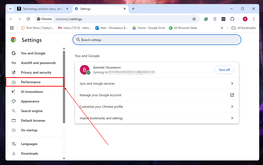 Step 3: On the left sidebar, select "Performance"