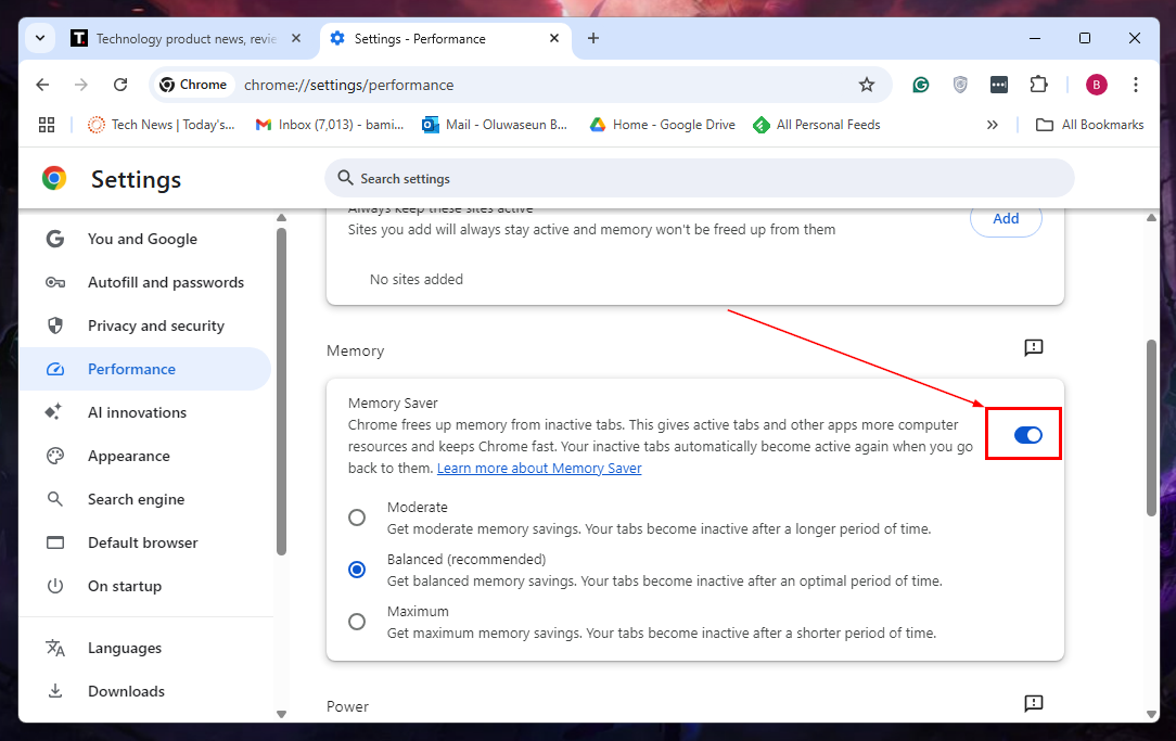 Step 4: Under the Memory section, switch on the Memory Saver toggle
