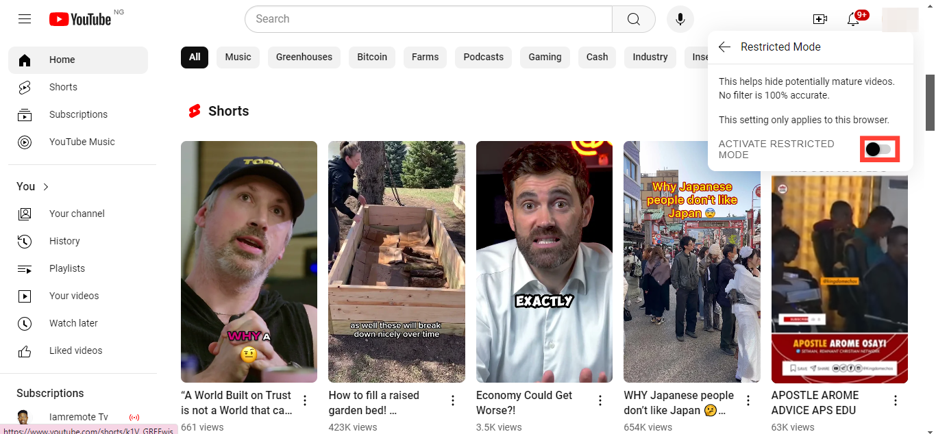 Step 4: A pop-up will appear with the option to toggle "Restricted Mode on". Click the toggle button to enable it.