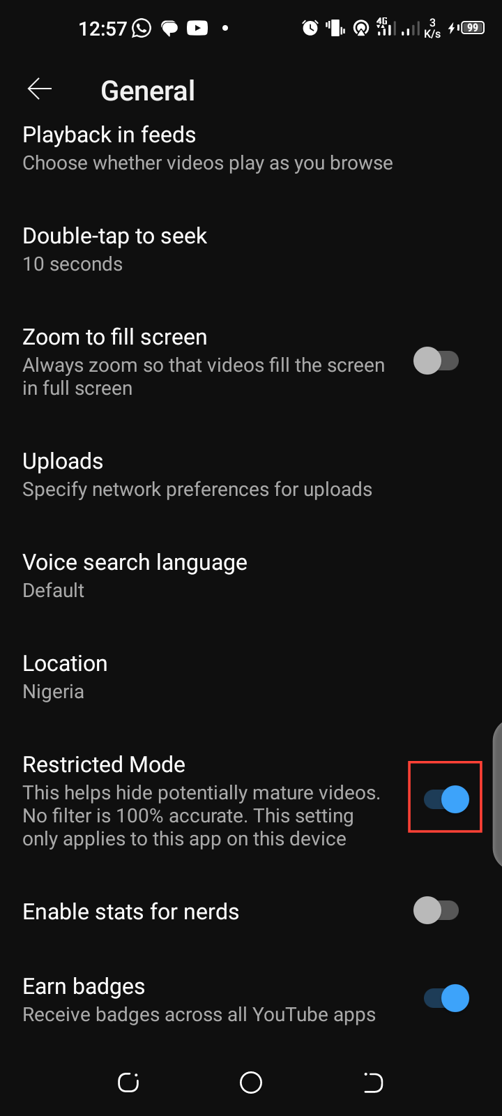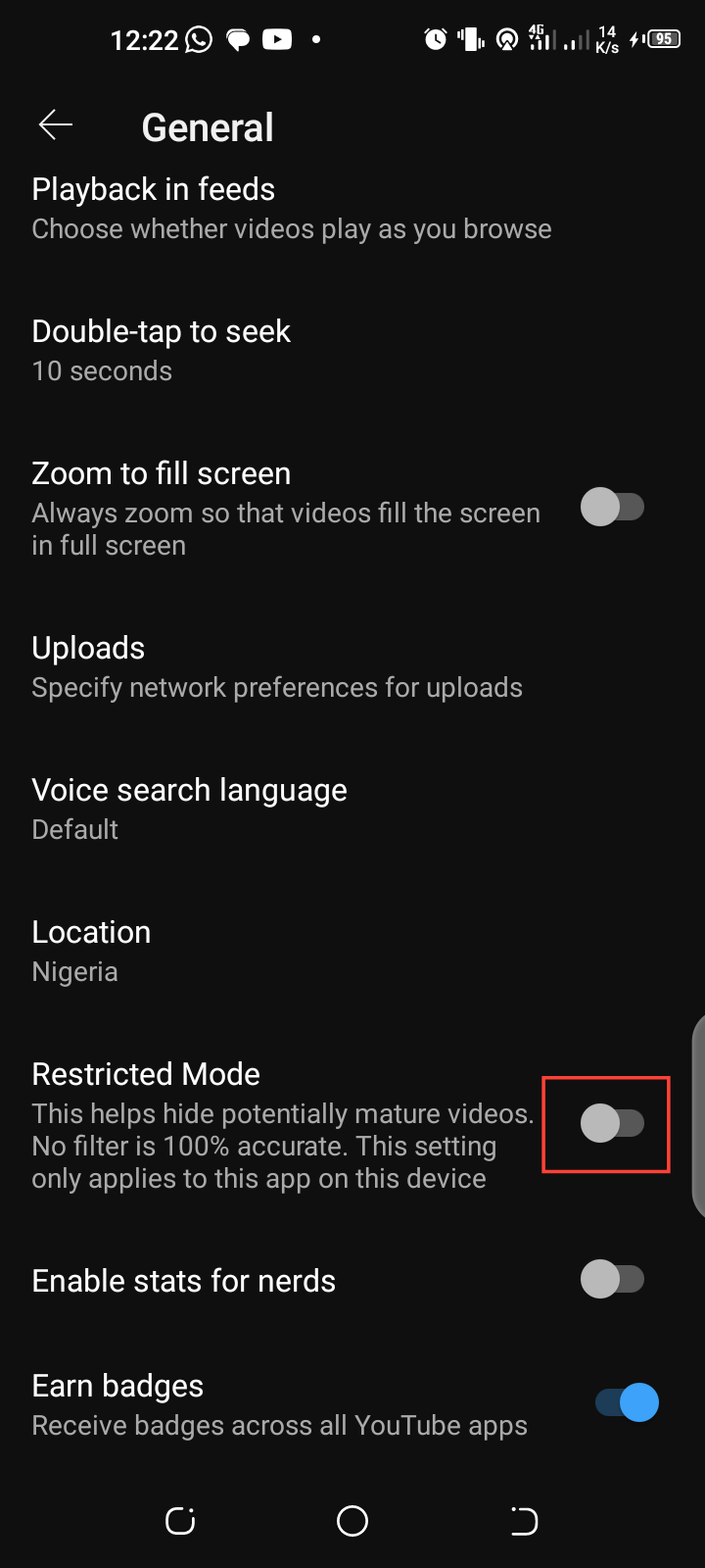Step 5: Scroll down until you see “Restricted Mode” and toggle the switch to the “on” position.