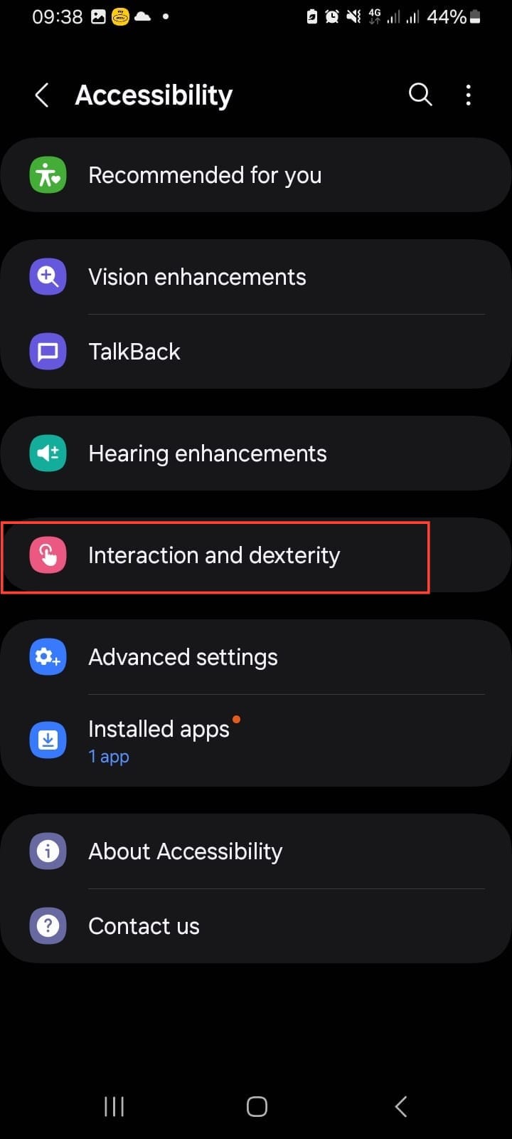 Step 2. Within the "Accessibility" settings, you will see different categories, including Vision, Hearing, and Interaction and Dexterity. Tap on Dexterity and Interaction, which contains settings to help users improve touch and button interactions.