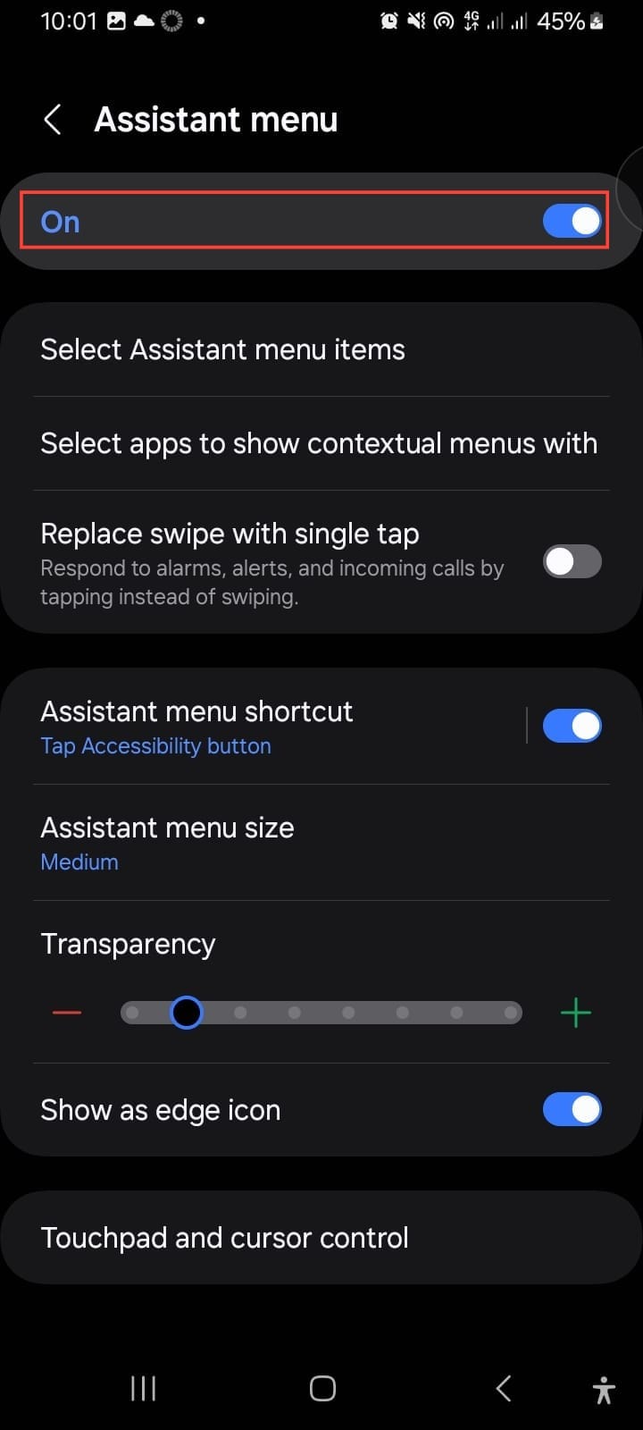 Step 4. At the top of the Assistant Menu screen, you will see a toggle switch. Tap on it to turn the feature On.