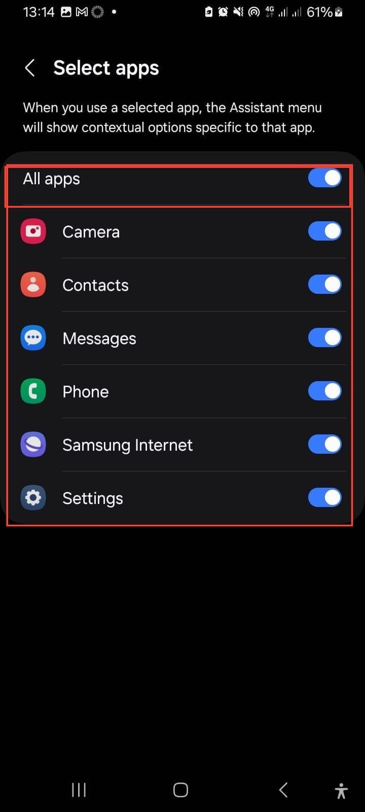 - To confirm the menu option for the selected apps, tap on any of the apps and click on the "Assistant Menu". You will see the contextual options in the menu.