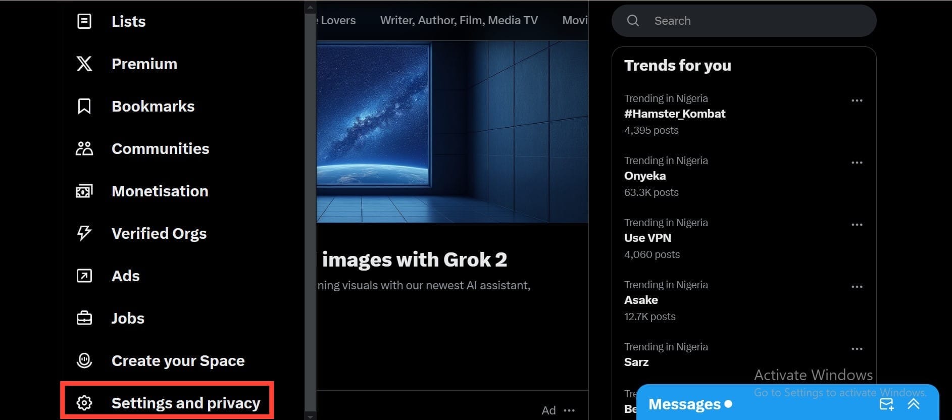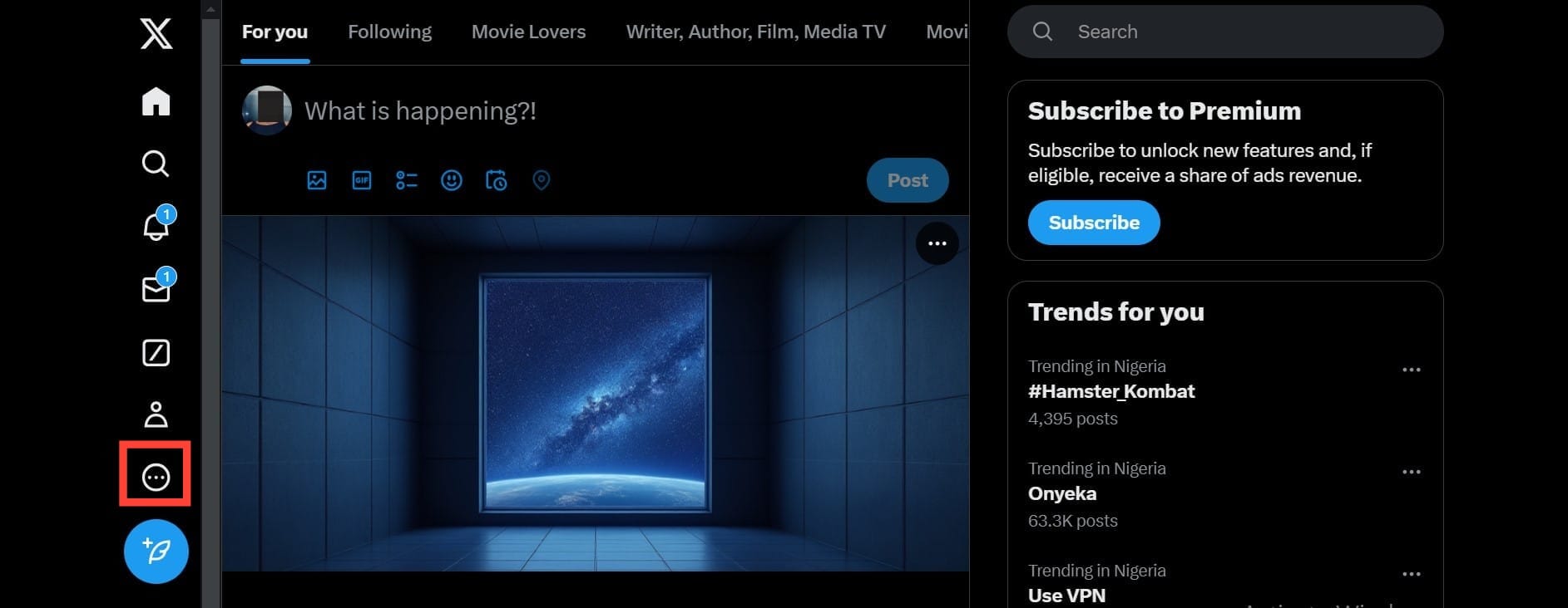 Step 1: Go to X.com. Then, tap the three lines in the bottom-left corner.