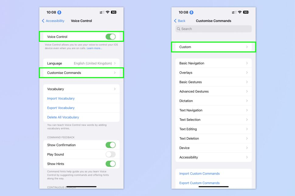 2. Toggle on the Voice Control button, then tap Customize Commands and select Custom.