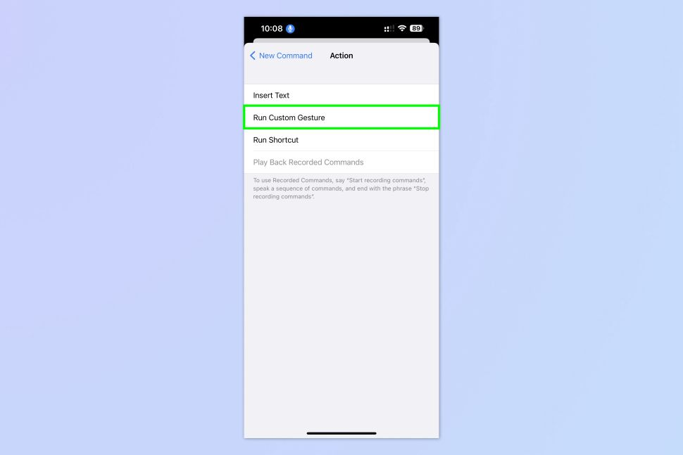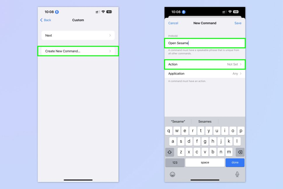 3. Tap Create New Command and type the phrase you want for your custom Voice Command then tap Action.