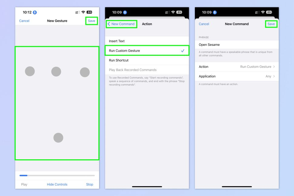 5. Set the Custom Gesture to match your passcode. When you're done, tap Save. Then ensure the Run Custom Gesture is ticked. Tap the New Command back button at the top left on the New Command screen, and finally, tap Save.