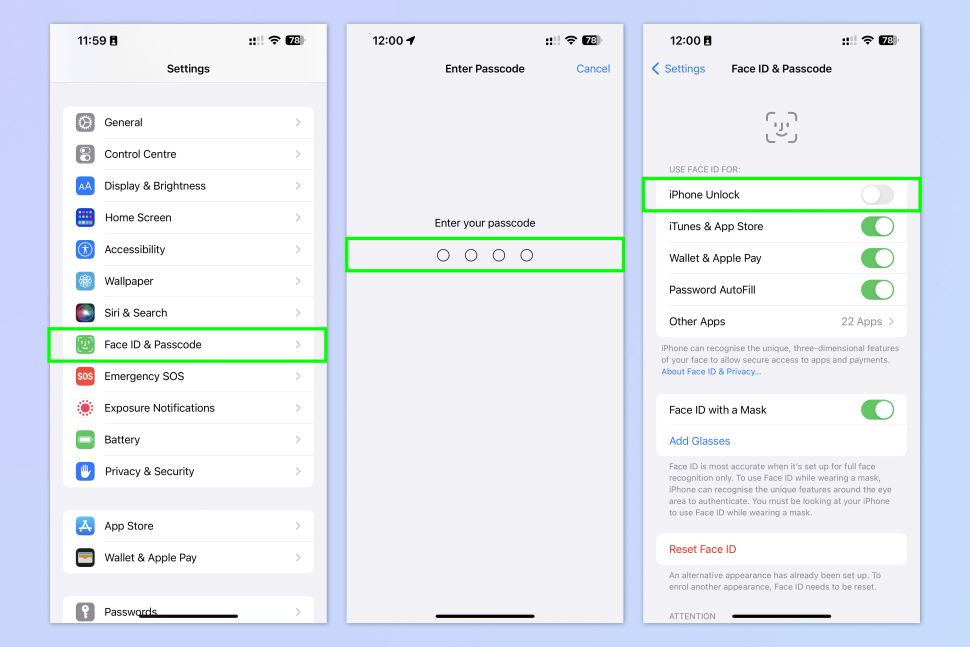 6. Disable your Face ID or Touch ID unlock by going to the Settings menu, and Tap Face/Touch ID & Passcode. Enter your passcode and toggle off iPhone Unlock.