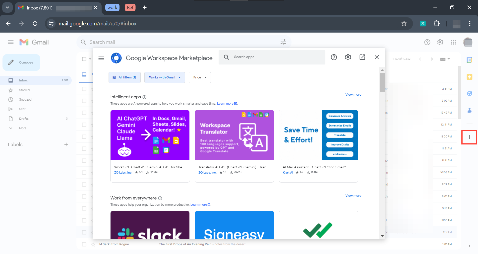 - Click the + in the right sidebar. This action launches the Google Workspace Marketplace.
