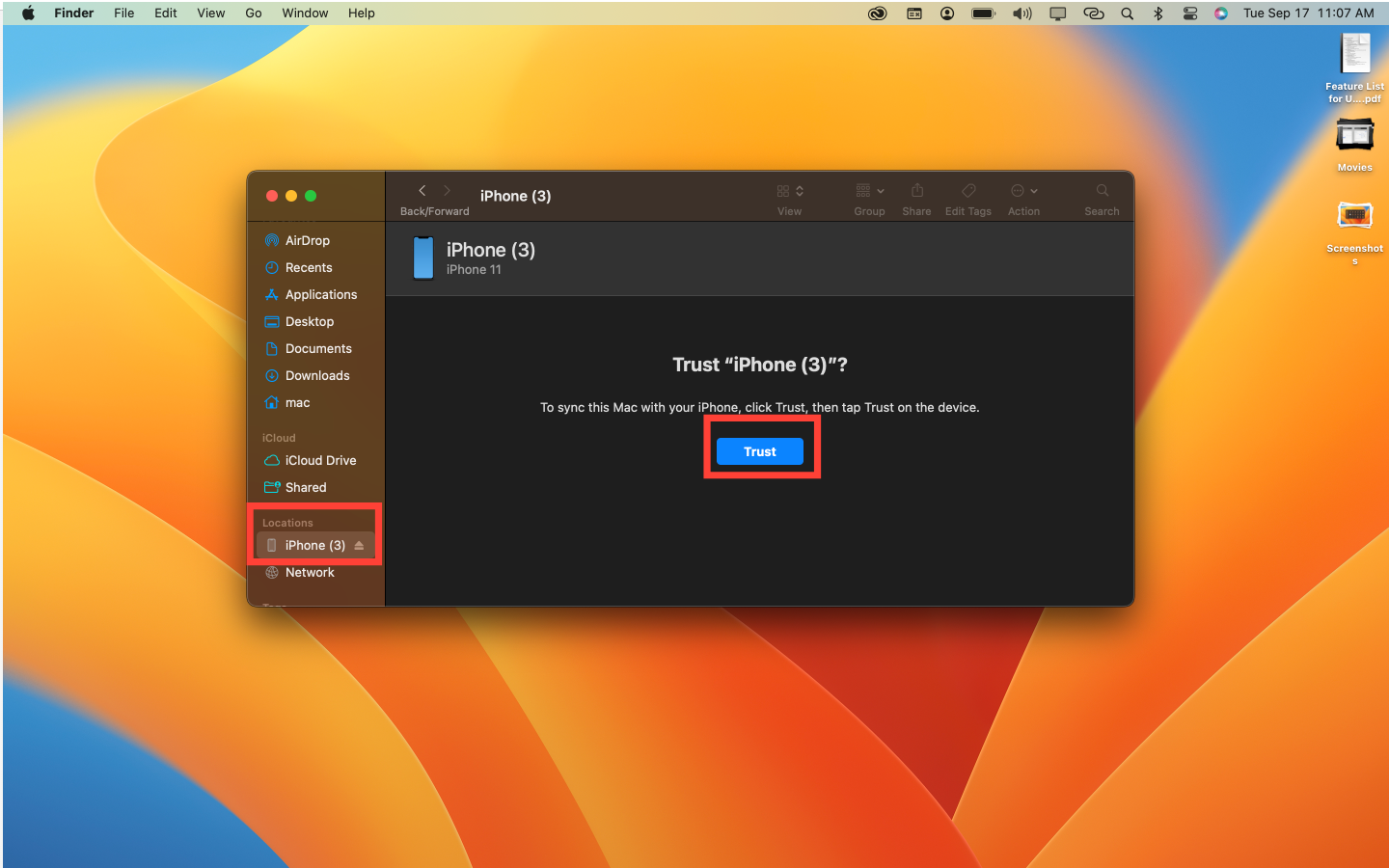 Step 3: Find your device under Devices or Locations in Finder or iTunes. Then, tap Trust.