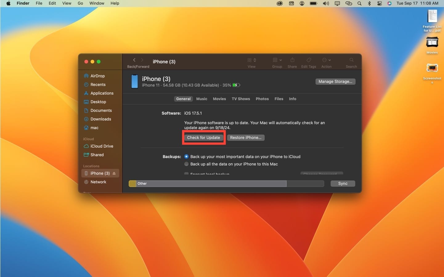 Step 2: Use Finder (on macOS Catalina or later) or iTunes (on older macOS versions).