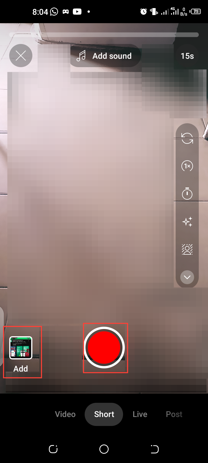 Step 2. Tap on the "+" icon at the bottom centre of your YouTube app to record or upload a short-form video. You can tap the red button to record and if you already have a short video to upload, tap "Add" to select your video.