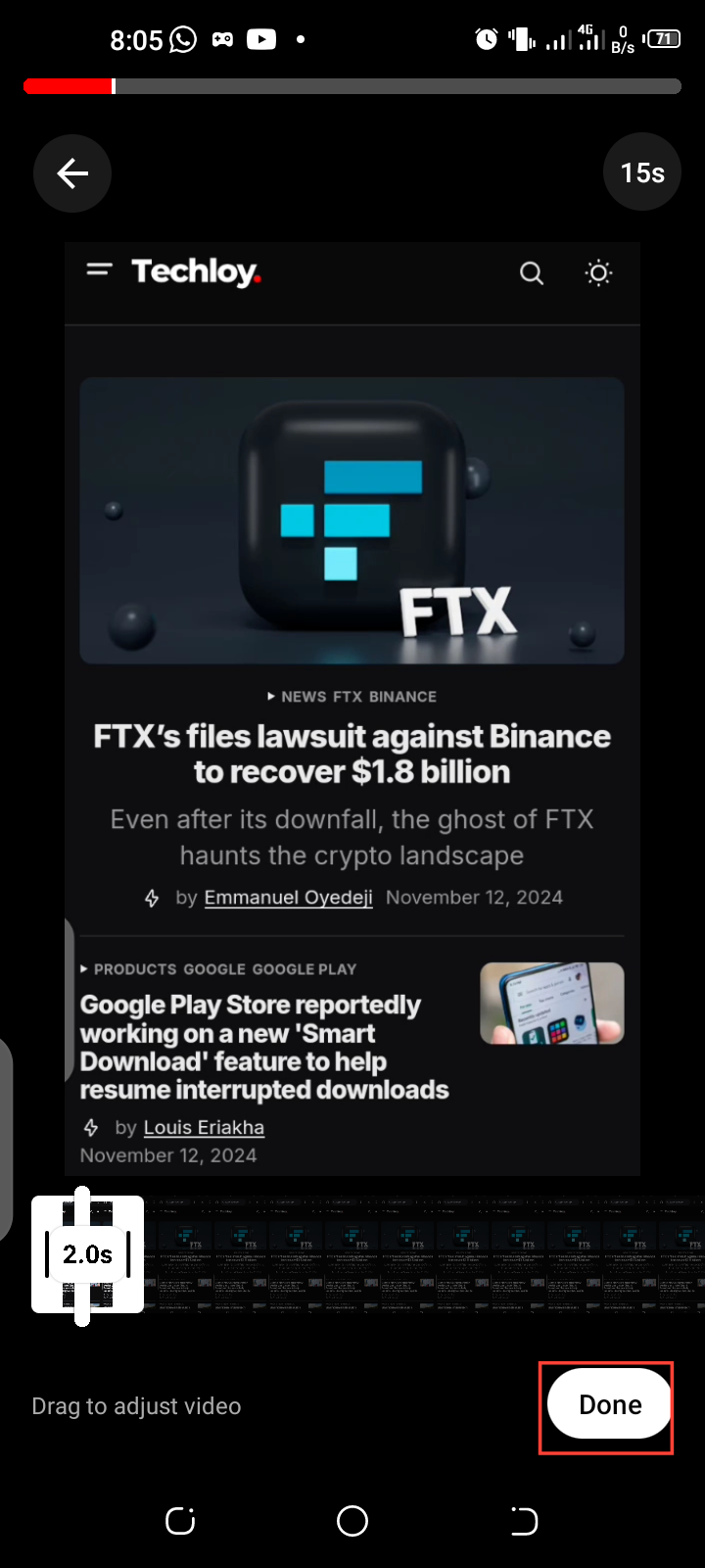 Step 3. After selecting your short video, tap "Next". You can crop the video length to your preference, then click "Done" and tap the "Check" button. This will direct you to the editing page.