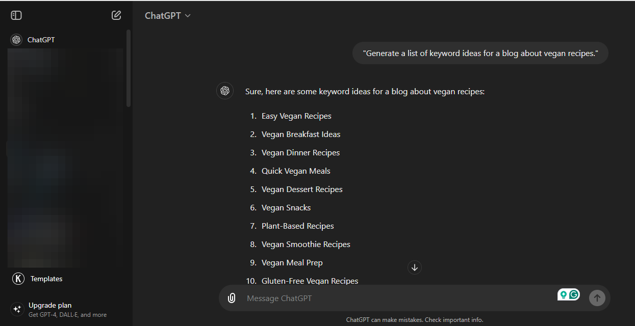 Sign in to your ChatGPT, and input prompt: "Generate a list of keyword ideas for a blog about vegan recipes."