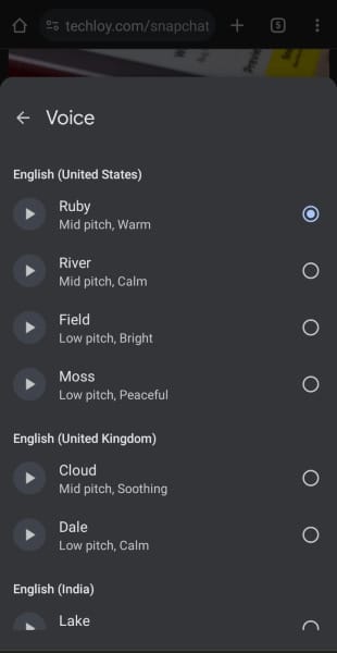 - To change the voice, select Voice from the options. You can test the voice by selecting Preview.
