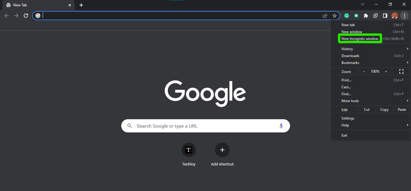 3. From the drop-down, select New Incognito Window.