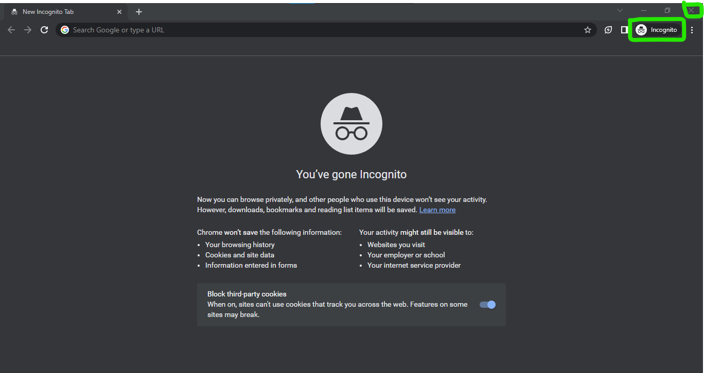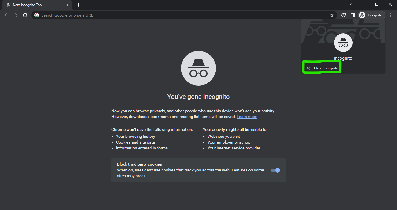 - Click on the X button at the top right corner of your screen to close the tab or click Incognito.