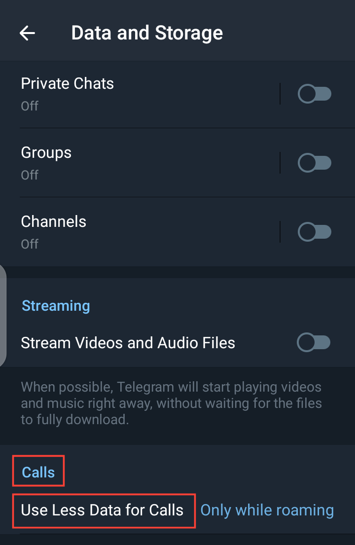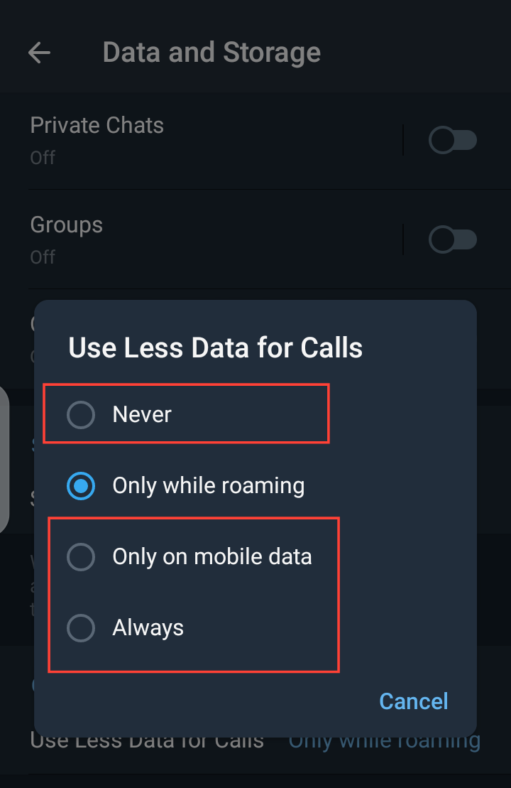 Step 5: Aside from the default option "Only while roaming". Telegram gives you three options for you to choose from.