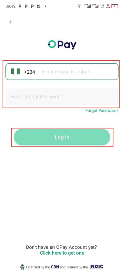 Step 1: Login to your Opay account by entering your registered number and password