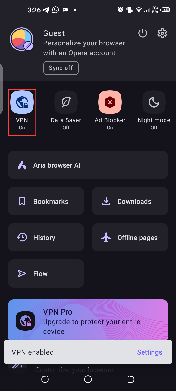 Step 3. Here, you’ll find the VPN option. Just tap on it to put it on, and you’re ready to surf the web with an added layer of privacy.
