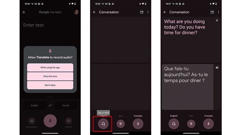 - To get a translation, press the microphone button when the other person is speaking. This will translate their statement for you in your preferred language.