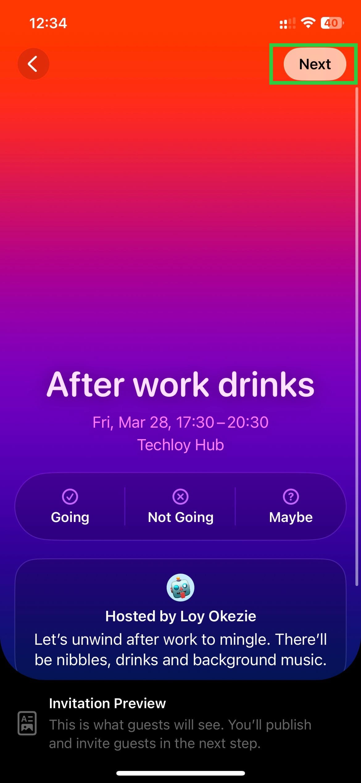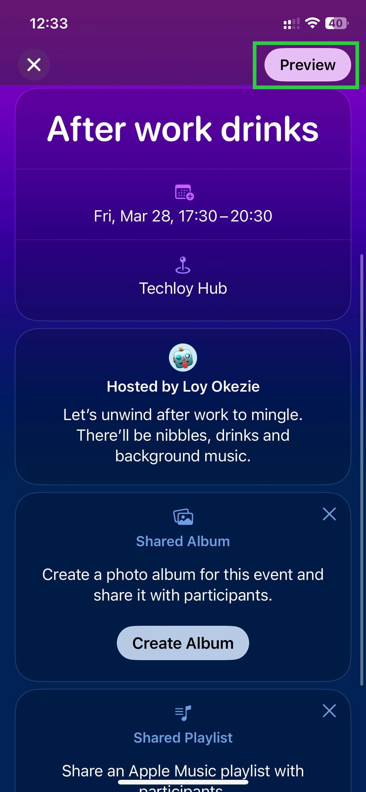 Step 5: Tap Preview at the top right to see how the invitation will look to your recipients.